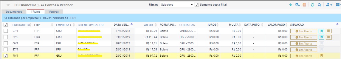 O sistema abrirá a tela com a listagem de títulos em aberto, renegociadas, pagos/baixados, cancelados ou de baixa manual.