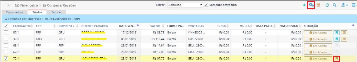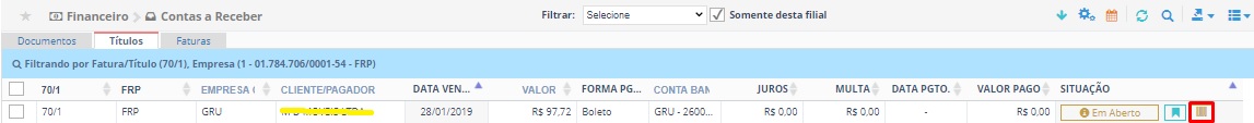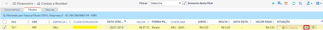 Para gerar uma remessa selecione um título que tenha um boleto e clique no botão . No HERMES, esses títulos são identificados pelo símbolo .