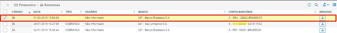 O sistema abrirá a tela com a listagem de títulos com as remessas geradas.