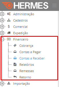 Para gerar uma remessa acesse o menu do HERMES TMS, selecione o MÓDULO FINANCEIRO, a opção CONTAS A RECEBER e acesse a aba TÍTULOS.
