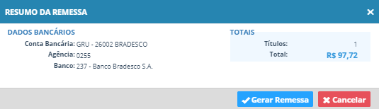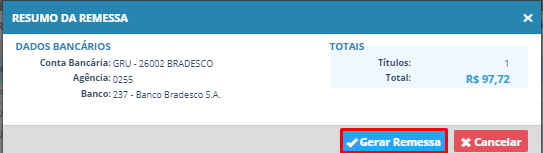 Esta ação abrirá a tela para confirmar a geração da remessa.